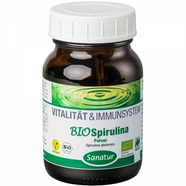 Sanatur BioSpirulina Pulver ist ein veganes, biologisches Nahrungsergänzungsmittel mit Vitamin A und Eisen