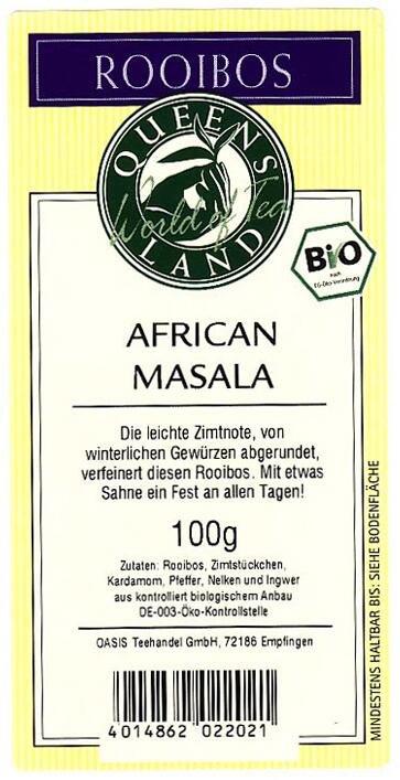 Zutaten: Rooibos Zimtstückchen, Kardamom, Pfeffer, Nelken und Ingwer aus kbA.